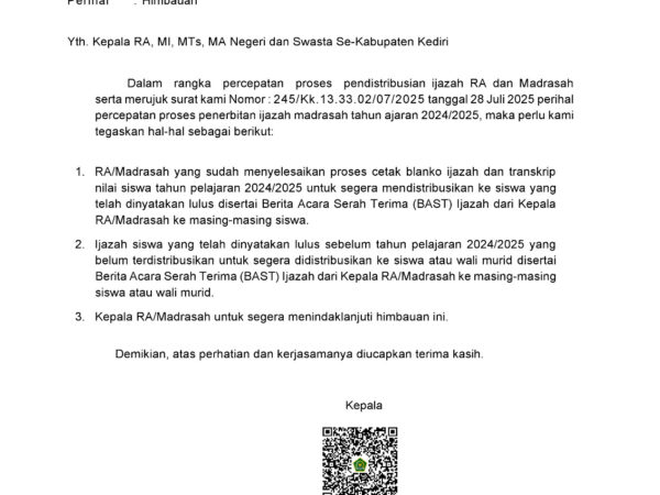 MA Ar Rosyaad mengeluarkan pemberitahuan resmi kepada para alumni terkait percepatan pendistribusian ijazah, menyusul terbitnya surat edaran dari Kementerian Agama Republik Indonesia, Kantor Kemenag Kabupaten Kediri, dengan nomor B-2563/Kk.13.33.02/PP.01/11/2025 tanggal..