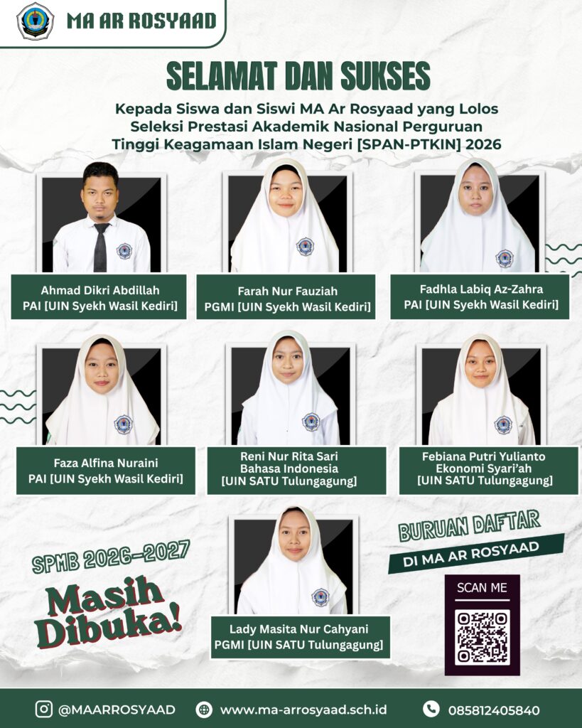 Kediri— Kabar membanggakan datang dari Madrasah Aliyah (MA) Ar Rosyaad. Sejumlah siswa dan siswi berhasil lolos Seleksi Prestasi Akademik Nasional Perguruan Tinggi Keagamaan Islam Negeri (SPAN-PTKIN) tahun 2026. Keberhasilan ini menjadi bukti nyata kualitas pendidikan dan pembinaan akademik di MA Ar Rosyaad.